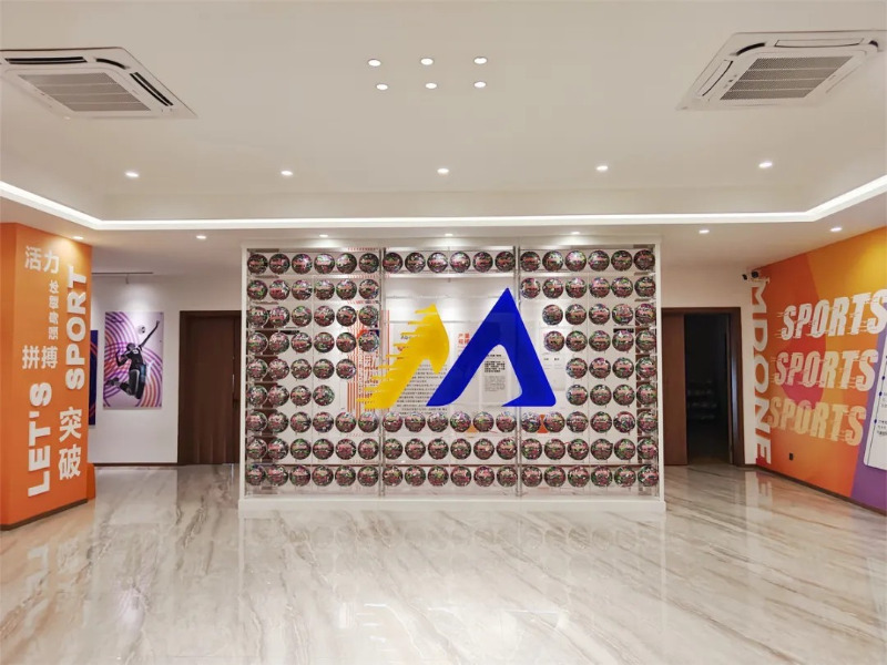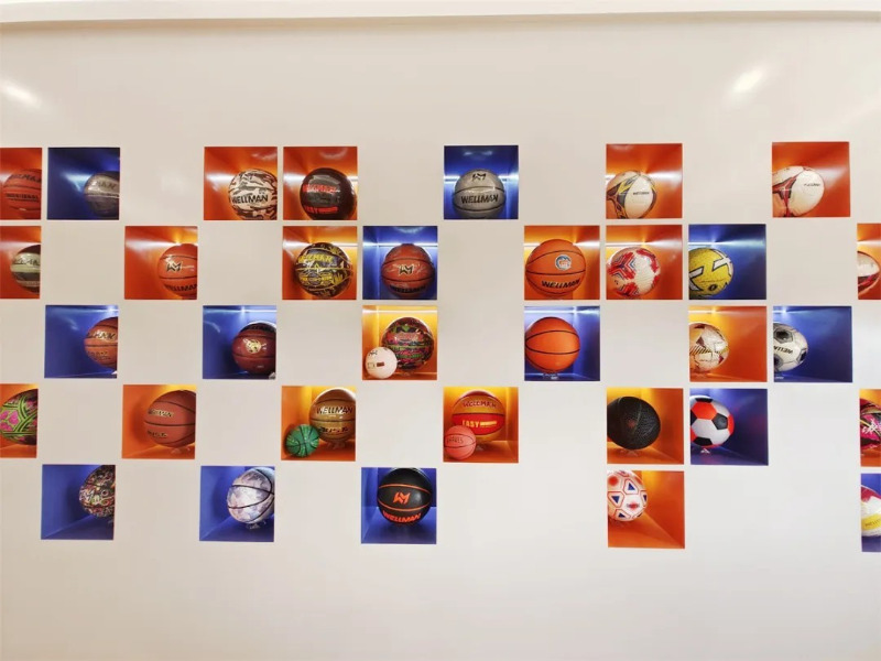 Sa showroom ng produkto ng Meidong sports, mayroong dose -dosenang mga basketball, football at volleyball na mga produkto ng iba't ibang mga estilo at maliwanag na kulay.