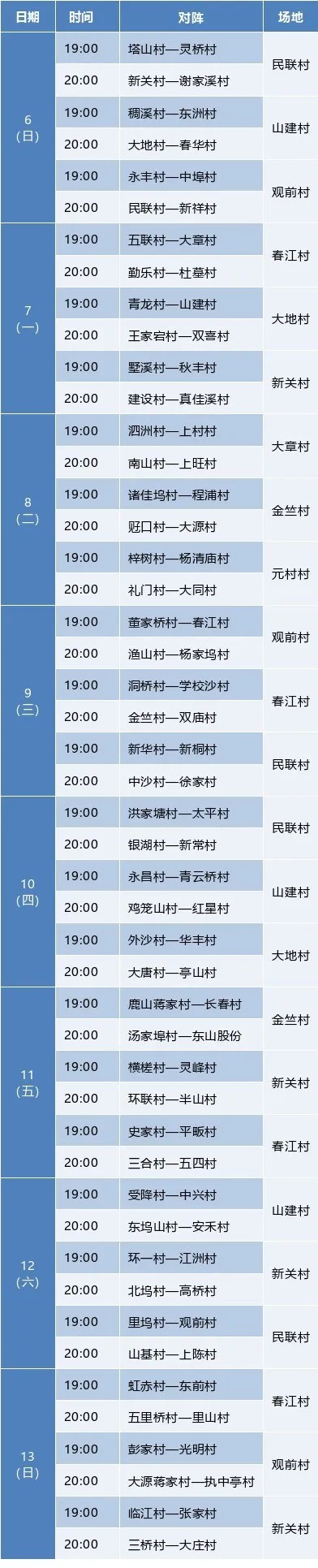 Ang kumpetisyon ay ginanap sa siyam na mga zone ng kumpetisyon: Minlian Village sa Dongzhou Subdistrict; Dadi Village, Jinzhu Village, at Guanqian Village (Zhougongwu) sa Yinhu Subdistrict; Chunjiang Village at Shanjian Village sa Chunjiang Subdistrict; Yuan Village sa Xindeng Town; ang Changlv Town Basketball Hall; at nayon ng Xinguman sa bayan ng Dayuan . Ngayong taon, mas maraming mga tao ang makakapanood ng mga kapana -panabik na mga laro sa kanilang pintuan.